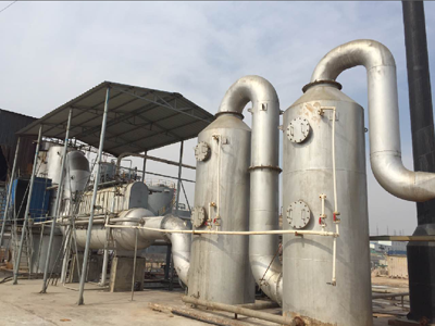 廢液和壓縮空氣經(jīng)管路控制系統(tǒng)進入霧化系統(tǒng),廢液霧化后噴入燃燒室,并依次通過迷宮除塵室和二次燃燒室,廢液中的有機物被焚燒,水分被蒸發(fā)。焚燒產(chǎn)生的高溫?zé)煔膺M入空氣換熱器,然后依次通過兩級急冷、吸附塔,煙氣中的微小粉塵及有害物質(zhì)(SO2、HCl等)被捕集吸收,經(jīng)處理后的干凈氣體由引風(fēng)機引入煙囪,排入大氣。
